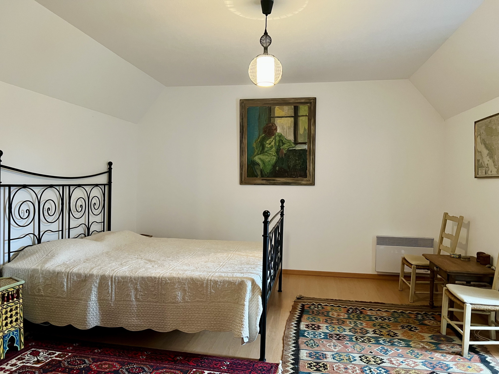 À l’étage, deux chambres de 20 m² chacune et une salle de bain avec WC apportent des volumes généreux pour toute la famille. Chauffage par radiateurs électriques et poêle à bois, double vitrage et combles isolés récemment assurent un confort optimal.